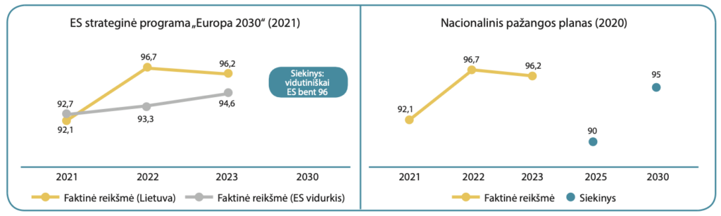 Nacionalinio pažangos plano (2020), kuris buvo atnaujintas 2024 m.2, esminis tikslas – sveikas ir laimingas žmogus, galintis veikti ir kurti, dirbti kokybišką darbą, gaunantis orias pajamas, gyvenantis darnioje bendruomenėje, įkvepiančioje ir palaikančioje, saugioje, sveikoje ir švarioje aplinkoje, ugdančioje pagarbą, atvirumą ir pasitikėjimą, vertybiniu pagrindu formuojamą valstybės politiką. Kartu siekiama puoselėti ir išsaugoti tautinę ir pilietinę tapatybę. Siekiant esminio tikslo, užsibrėžta įgyvendinti 10 strateginių tikslų sudėtingiausiems Lietuvos iššūkiams ir problemoms įveikti. Pagrindinis ikimokyklinio, priešmokyklinio ir bendrojo ugdymo tobulinimo kryptis nusakantis strateginis tikslas – didinti švietimo įtrauktį ir veiksmingumą, siekiant atitikties asmens ir visuomenės poreikiams. Siekiant šio tikslo, iškelti tokie pažangos uždaviniai: